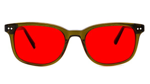 Model is wearing Cedar Olive blue light glasses with Red lenses.